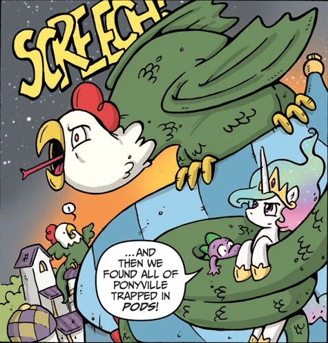 In a mini-comic included with Friendship is Magic Issue 4 titled "In the Interim..." a horde of giant mutant cockatrices tries to invade Canterlot during the passing of the Secretariat comet, but Spike and Princess Celestia are able to defeat them. A cockatrice appears on cover RI of My Little Pony: Friends Forever Issue #4.