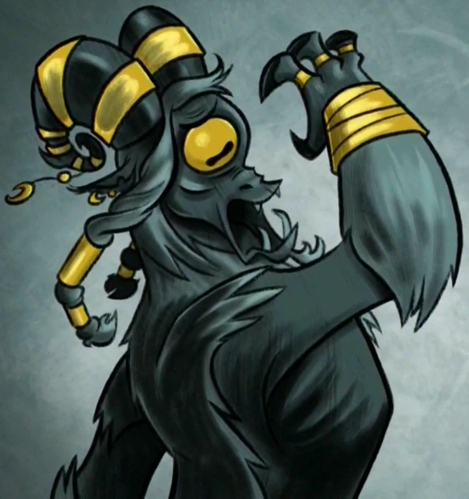 Ahuizotl is a dog-like creature from the book Daring Do and the Quest for the Sapphire Stone in the episode Read It and Weep and in the episode Daring Don't. He is Daring Do's main antagonist in her quest to retrieve the sapphire stone. He has an elongated dog-like head, with eyes positioned over his nose at the end of his snout. He walks on all fours, with dog-like hind limbs and ape-like forelimbs, and a long monkey-like tail with a hand on its end. Ahuizotl has a tuxedo-style coat, having dark blue fur over most of his body, while his stomach, lower jaw and limbs are of a lighter blue. Ahuizotl wears golden colored jewelry, such as a necklace, a single ear ring, and three bracelets, one for each foreleg, and one around his tail's wrist. He is voiced by Brian Drummond in both episodes.[1]