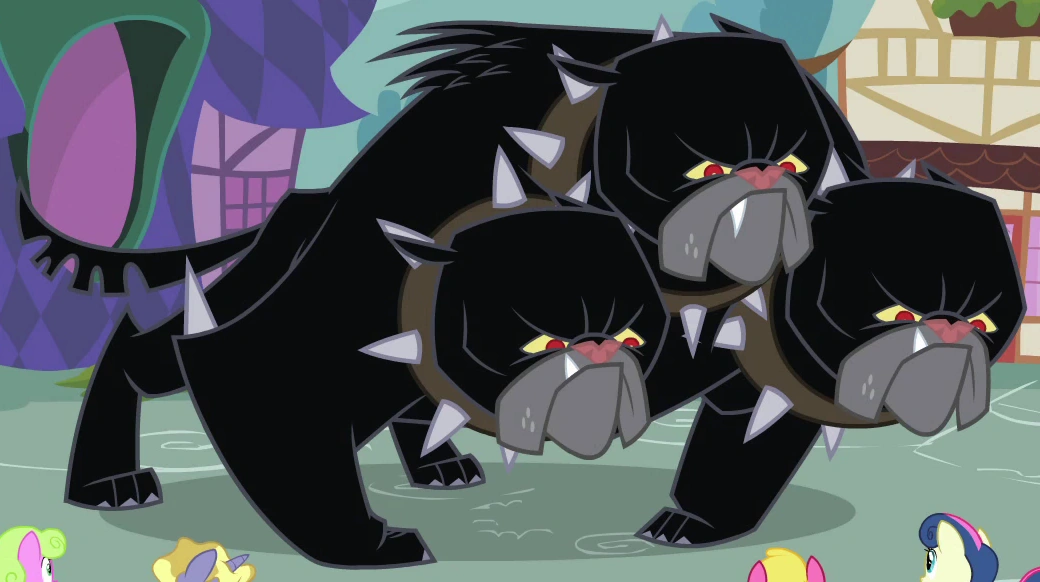 Cerberus is a giant three-headed dog that appears in It's About Time and Twilight's Kingdom - Part 2. According to Twilight, Cerberus is responsible for guarding the gates of Tartarus and that, with Cerberus away from Tartarus, the "ancient evil creatures" imprisoned there could escape and destroy Equestria.