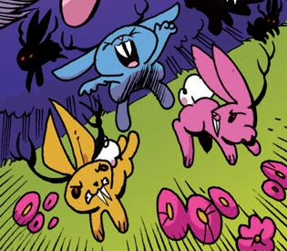 - On the first page, a jackalope appears in Fluttershy's garden, confusing Scootaloo.