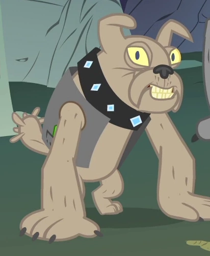 Lauren Faust stated that the names the Diamond Dog leaders were given in the script are Rover, Fido and Spot. However, she didn't recall which ones have which name.[1][2] Their identities have since been confirmed by the show's supervising director Jayson Thiessen,[3] later by merchandise, and later still partly by promotional material. Rover, the medium-sized dog, is the leader of the trio, while Fido is the large-sized one and Spot is the small, bulldog-like one. Rover is voiced by Scott McNeil, Fido is voiced by Garry Chalk and Spot is voiced by Lee Tockar. Spot's name was previously used for a G1 puppy dog. The name "Diamond Dogs" is a reference to David Bowie's 1974 album of the same name.