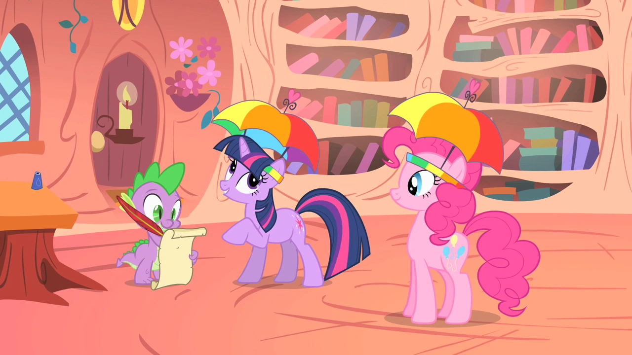 The two reach Golden Oak Library, and Pinkie Pie tells Twilight that different combinations of her reactions also predict the future, for example "ear flop, then knee twitch, then eye flutter." means the sky will be graced with a beautiful rainbow. Pinkie then experiences "ear flop, eye flutter, knee twitch," and Twilight gets squashed by Spike slamming the library door open. Spike backs up out of the library with an armload of books, accompanied by a sound effect of a truck backing up. Twilight, still recuperating, tells Pinkie that she said the combo meant "beautiful rainbow," and Pinkie corrects her about the order of the twitches, which in this case meant "look out for opening doors." Pinkie tells Twilight she doesn't believe because she doesn't understand. Twilight hums and rubs her chin with a thoughtful expression on her face.