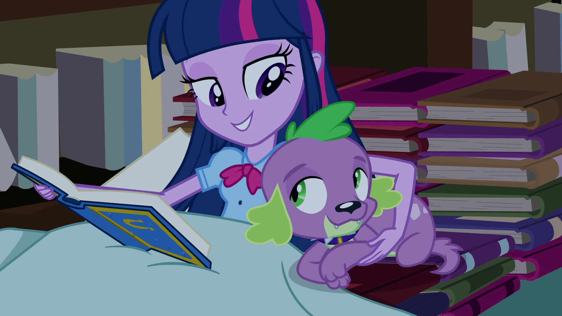 That evening, as the library nears closing time, it occurs to Twilight that she hadn't thought about where she and Spike are going to sleep. Luckily, Spike had thought ahead and assembled a bed out of books for them to sleep on, having discovered a rarely used section tucked away on the second floor of the library. Meanwhile, Twilight's research into the school has yielded a yearbook. Inside, she found an old photo of Pinkie Pie, Rainbow Dash, Applejack, Fluttershy, and Rarity. Although the five appear to be friends in the photo, they don't seem to be friends now. Spike reminds Twilight that she can't focus on why the girls are no longer friends: making friends and beating Sunset Shimmer comes first.