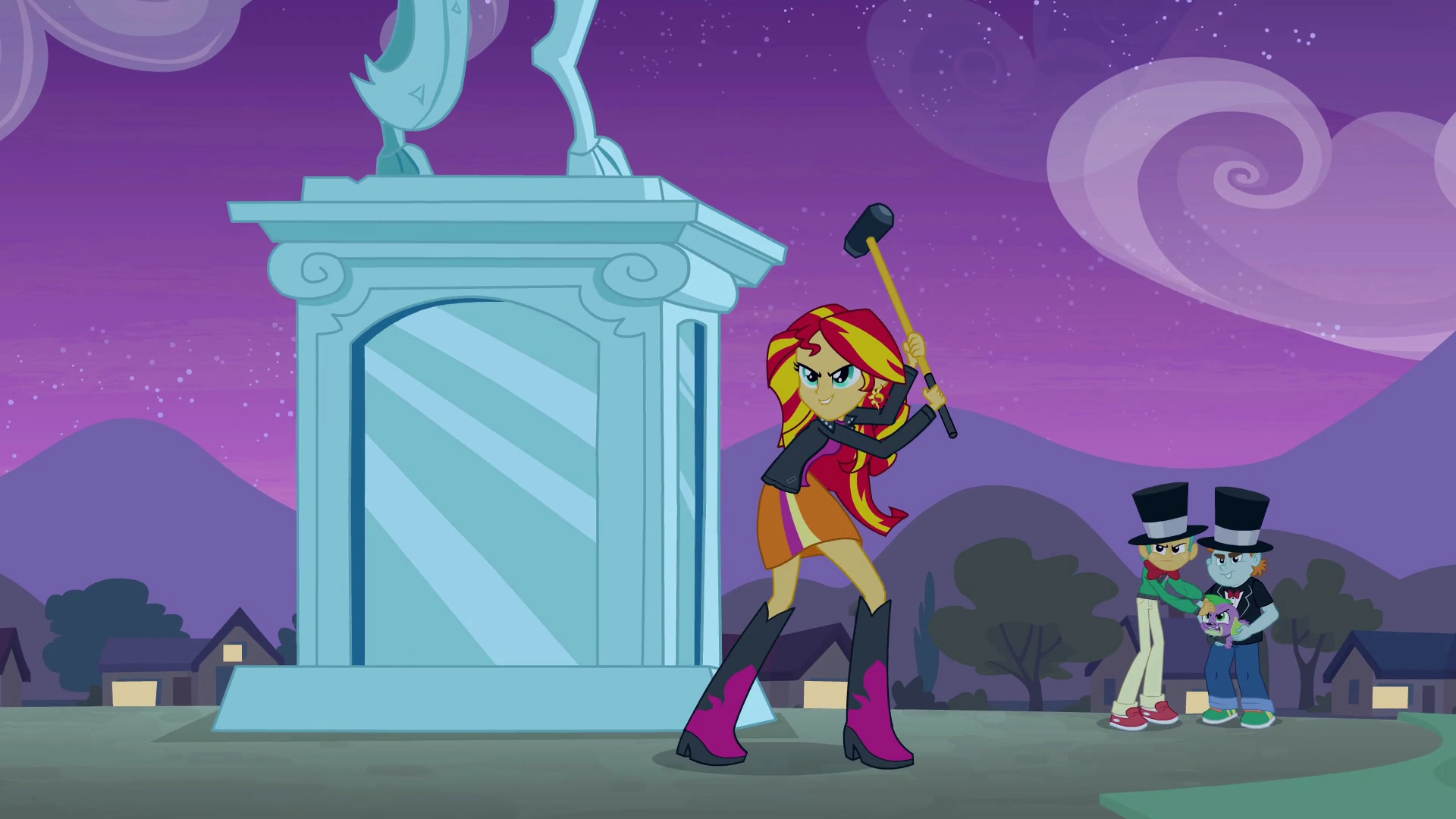 As Principal Celestia congratulates Twilight and places the Fall Formal crown on her head, Snips and Snails sneak into the auditorium through a back door and kidnap Spike. Spike screams out for Twilight, and she runs out after the duo, followed quickly by her friends. Snips and Snails take Spike into the school courtyard near the statue, where Sunset Shimmer is waiting.