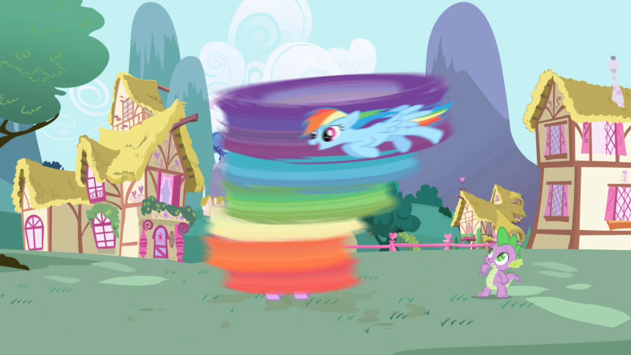 In May the Best Pet Win!, Rainbow Dash performs dangerous stunts to demonstrate a flying course through the Ghastly Gorge. She flies through giant bramble patches and dodges attacking quarray eels.